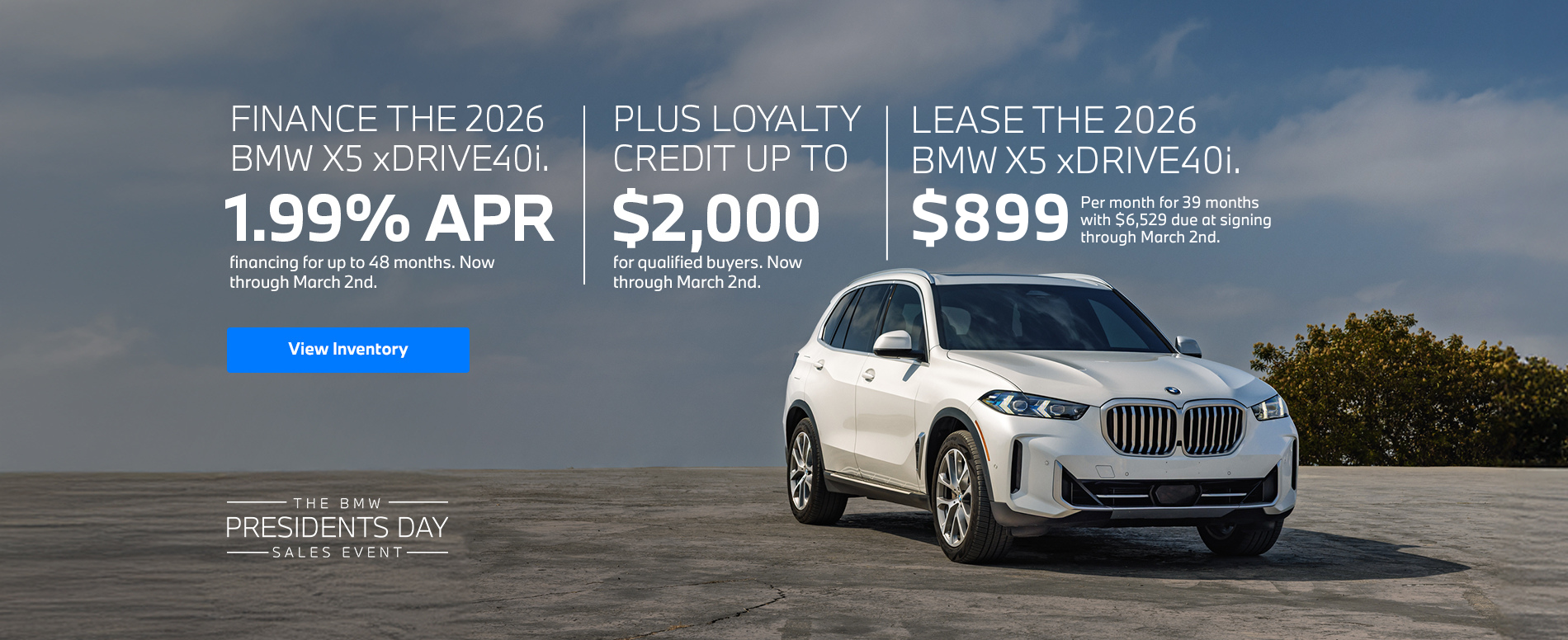 1.99% APR financing for up to 48-month term. Plus, loyalty credit up to $2,000 for qualified buyers. Lease for $899/month with $6,529 due at signing. Now through March 2nd.