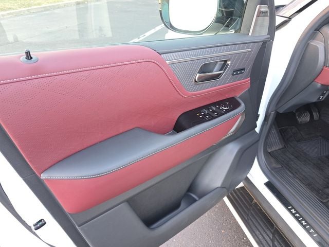 AUTOGRAPH Exterior Package (Dark Matte Rear Bumper Protector and Silver Cross Bars), Black Interior Lighting Package (INFINITI Radiant Black Cargo Scuff Plates and Panoramic Illuminated Headliner), Smart Luggage Shelf, 3rd row seats: bench, 4-Wheel Disc Brakes, ABS brakes, Adaptive suspension, Air Conditioning, Alloy wheels, AM/FM radio: SiriusXM with 360L, Anti-whiplash front head restraints, Apple CarPlay/Android Auto, Audio memory, Auto High-beam Headlights, Auto tilt-away steering wheel, Auto-dimming door mirrors, Auto-dimming Rear-View mirror, Auto-leveling suspension, Automatic temperature control, Brake assist, Bumpers: body-color, Cargo Blocks, Cargo Blocks/Stabilizers, Center Front Spoiler, Climate Controlled Front Bucket Seats w/Massage, Compass, Delay-off headlights, Driver door bin, Driver vanity mirror, Dual front impact airbags, Dual front side impact airbags, Electronic Stability Control, Emergency communication system: INFINITI InTouch, Four wheel independent suspension, Front anti-roll bar, Front Bucket Seats, Front Center Armrest, Front dual zone A/C, Front reading lights, Fully automatic headlights, Garage door transmitter: myQ Connected Garage, Genuine wood dashboard insert, Genuine wood door panel insert, Heads-Up Display, Heated door mirrors, Heated front seats, Heated rear seats, Heated steering wheel, HVAC memory, Illuminated entry, Knee airbag, Leather steering wheel, Literature Kit, Low tire pressure warning, Memory seat, Navigation System, Navigation system: Google Built-in, Occupant sensing airbag, Outside temperature display, Overhead airbag, Overhead console, Panic alarm, Passenger door bin, Passenger vanity mirror, Power door mirrors, Power driver seat, Power Liftgate, Power moonroof, Power passenger seat, Power steering, Power windows, Radio data system, Radio: Klipsch Reference Premiere Audio System, Rain sensing wipers, Rear air conditioning, Rear anti-roll bar, Rear reading lights, Rear seat center armrest, Rear window defroster, Rear window wiper, Reclining 3rd row seat, Remote keyless entry, Security system, Semi-Aniline Premium Leather Seating Surfaces, Speed control, Speed-sensing steering, Splash Guards, Split folding rear seat, Spoiler, Steering wheel memory, Steering wheel mounted audio controls, Super Premium Paint, Tachometer, Telescoping steering wheel, Tilt steering wheel, Traction control, Trip computer, Turn signal indicator mirrors, Variably intermittent wipers, Ventilated front seats, Ventilated rear seats, and Wheels: 22 x 8 Cast Aluminum Alloy.