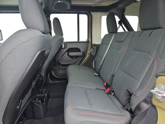 Quick Order Package 22R Rubicon, 4-Wheel Disc Brakes, 4.10 Rear Axle Ratio, 4G LTE Wi-Fi Hot Spot, 8 Speakers, 97 MPH Vehicle Max Speed Calibration, ABS brakes, Air Conditioning, Alloy wheels, AM/FM radio: SiriusXM, Apple CarPlay, Apple CarPlay/Android Auto, Automatic temperature control, Aux Battery, Auxiliary Switches, Black 3-Piece Hard Top, Brake assist, Class II Receiver Hitch, Cloth Low-Back Bucket Seats, Compass, Connectivity - US/Canada, Delay-off headlights, Driver door bin, Driver vanity mirror, Dual front impact airbags, Dual front side impact airbags, Electronic Stability Control, Emergency communication system: Jeep Connect, Freedom Panel Storage Bag, Front anti-roll bar, Front Bucket Seats, Front Center Armrest w/Storage, Front dual zone A/C, Front fog lights, Front License Plate Bracket (DISC), Front reading lights, Fully automatic headlights, Google Android Auto, Heated door mirrors, Illuminated entry, Integrated roll-over protection, Low tire pressure warning, Non-Lock Fuel Cap w/o Discriminator, Occupant sensing airbag, Outside temperature display, Overhead airbag, Panic alarm, ParkView Rear Back-Up Camera, Passenger door bin, Passenger vanity mirror, Performance Suspension, Power door mirrors, Power steering, Power windows, Radio data system, Radio: Uconnect 5 w/12.3 Display, Rear anti-roll bar, Rear reading lights, Rear Window Defroster, Rear Window Wiper/Washer, Remote keyless entry, Security system, Speed control, Split folding rear seat, Steering wheel mounted audio controls, Stop-Start Dual Battery System, Tachometer, Telescoping steering wheel, Tilt steering wheel, Traction control, Trip computer, Variably intermittent wipers, Voltmeter, Wheels: 17 x 7.5 Machined w/Black Pockets, and Wheels: 17 x 7.5 Machined/Painted Black.